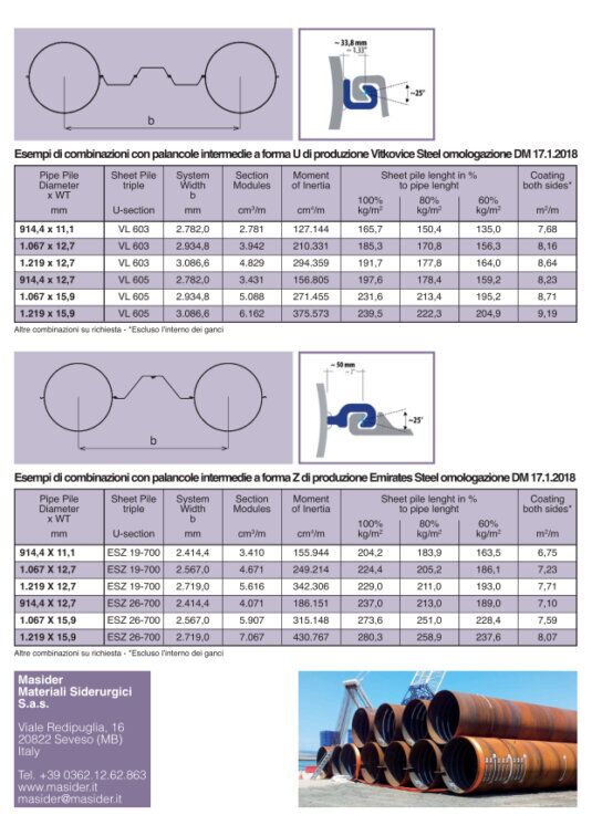 Le palancole, "da sole" a volte non bastano; alternandole ai tubi spiralati, si ottengono pareti combinate altamente performanti, che possono avere palancole intermedie a forma U singole, doppie, oppure triple, di produzione Vitkovice Steel/Emirates Steel, ma anche palancole a forma Z di produzione Emirates Steel.